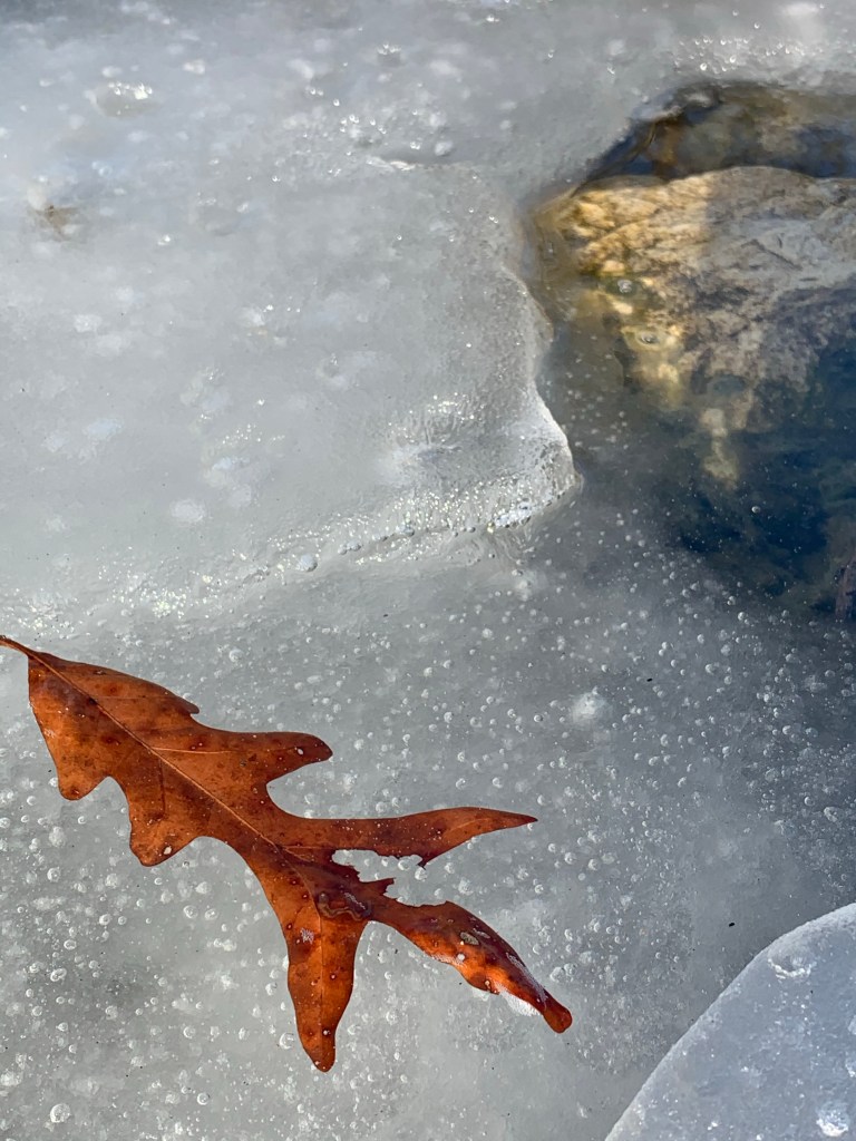 Do we treasure this lonely, frozen, oak leaf, roughed up by the life it lived, if we view it as protected by its ice rather than trapped by the frozen lake? We can see the leaf, acknowledge the leaf, wonder about the leaf. Can we be patient with the leaf and its ice? Can we trust nature and its process? After all, it’s protected the leaf through this long winter. Can we rely on the knowledge that our oak leaf will soon float free and drift to the solid rock?