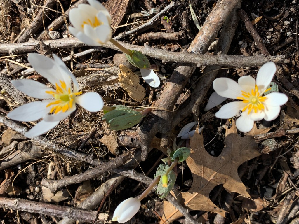 Both tough and fragile, bloodroot are complicated treasures. The “bloom where you’re planted” phrase, taken literally, could be about bloodroot. They are not transplant fans. If you pluck one from its stem or pull it and break the root, you’ll find a runny red center. In the past, that sap has been used as dye and war paint. Also, they are poisonous. Complicated little treasures.