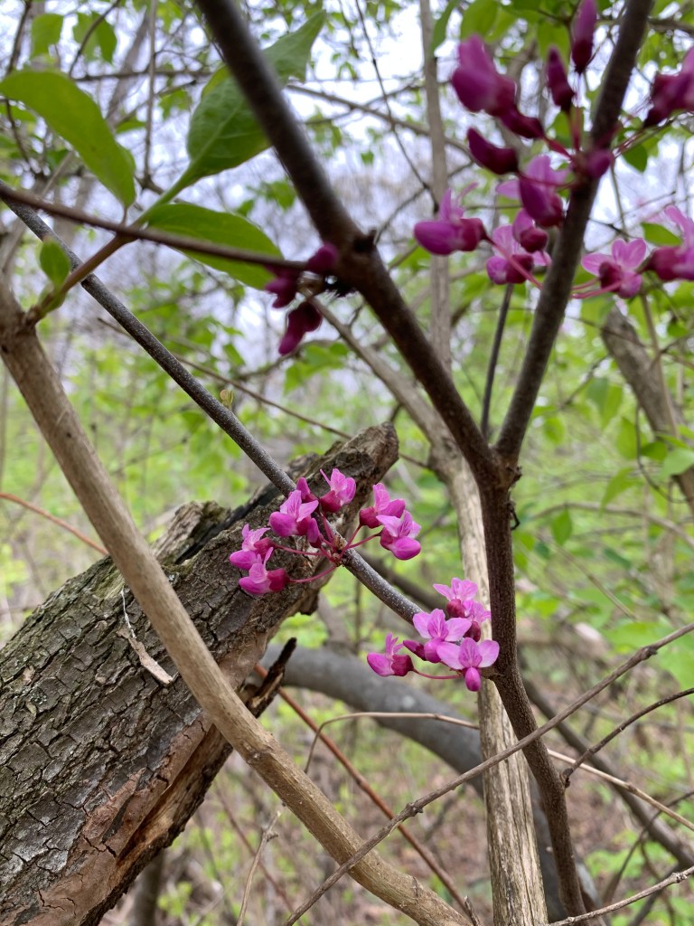 But today, in an eye-high snarl of vines and limbs and detritus, I saw a flash of pink. Something in that pile of dead and dying timber was a redbud. The main part of the tree bore no buds, but a few shoots had pushed their way into the light and brought buds to the brush pile.