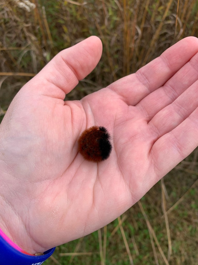 Early in the walk, I spotted two wooly worms, picked one up, and studied it. It didn’t crawl onto my finger as I’d remembered. I haven’t picked up a wooly worm for several years; maybe I imagined the crawling onto my finger part. The poor little thing was terrified and immediately curled itself into a protective bristly ball. It had mad squirming skills, too; if I touched it, it scooted across my palm, still curled into a wooly ball. I apologized, gently set it back on the ground, and continued on my way, newly paranoid about stepping on wooly worms. I admire that little worm and its protective instinct; I don’t want to kill it or its pals.