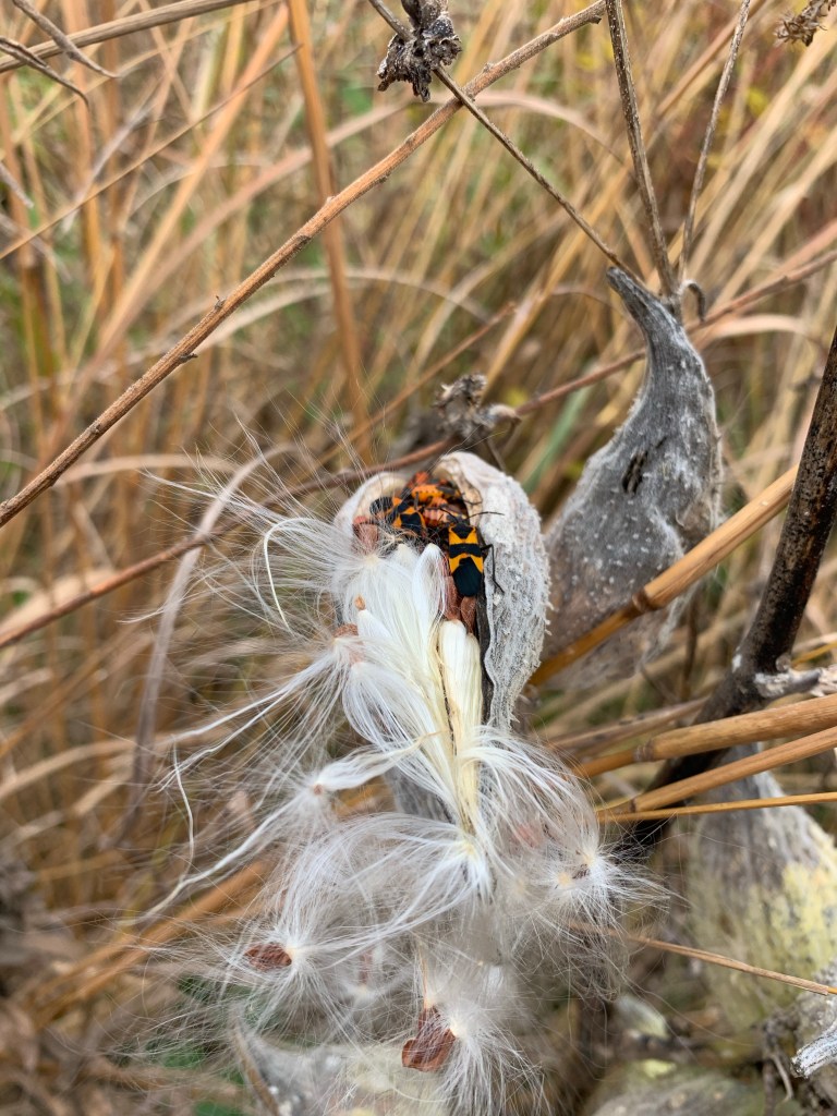 On today’s gentle breeze, milkweed seeds drifted away to do their thing. I was drifting, too, not hurrying; quite the opposite, I was determined to take my time. Slow steps, slow breaths, slow thoughts. So, I plucked a handful of milkweed seeds and their fluffy parachutes from a pod, studied them, and let them go on the wind. You know what? Even nature, moving naturally, can tangle and falter. Each of those seeds, carried through the air, took a different flight path. A few drifted up and over the tall grasses and out onto the prairie, but some snagged on native plants, stuck indefinitely. Still others pole-danced their way around a stalk and flung themselves down the path. All left my hand on the same gust of wind, but soon flew unique paths.