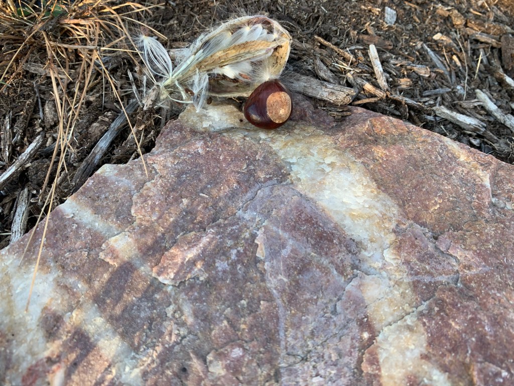 That nesting doll doesn’t know everything. In my left pocket, I carried a buckeye from Cooper’s Woods. As I walked, I collected milkweed pods and other interesting dry plants. And as I walked, I talked. I talked to God, to myself, to Cooper. Eventually, I reached the bench in the center. There’s a nice flat rock at one end of the bench, and that’s where I laid the buckeye and the most interesting of the pods. Maybe some creature or the wind will take them. Maybe not. It doesn’t matter. Leaving then mattered. I sat on the bench with my eyes closed, tears dripping from my cheeks, late afternoon sun warming my back. I took what the space offered. It works for me.