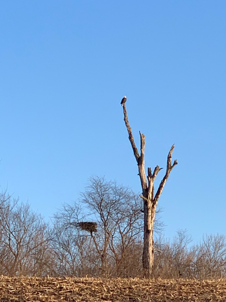 Several times last year, I saw a bald eagle atop a dead tree on Spring Lake road. I posted a picture, and a friend commented that his wife had spotted the nest. I began my search for the nest, but all summer I couldn’t see it through the leaves. Yesterday, finally and from quite a distance, I saw the nest. I’m old enough to remember bald eagles being scarce; I didn’t see one in our area until I was an adult. Now there are days I see several eagles, sometimes in pairs. The nests, though, elude me. I did my best “out for a Sunday drive” impression, creeping along the blacktop until I found a vantage point, turned on my flashers, and hopped out of my car. I only had my phone and monocular, but I did what I could. I’ll be back.